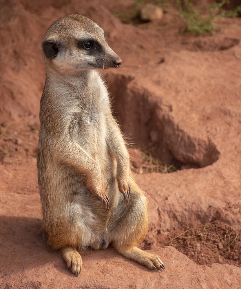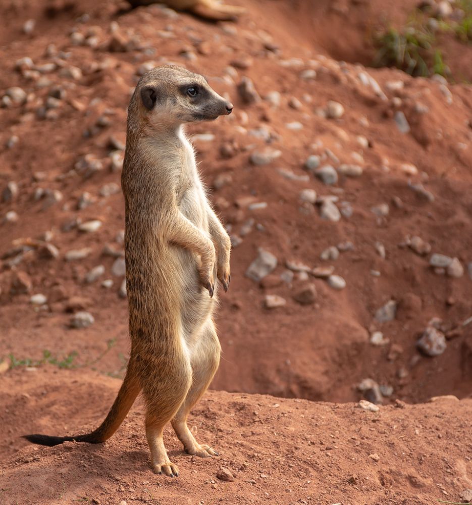 Dieses Erdmännchen nimmt ein Sonnenbad unter einer Heizlampe und fühlt sich dabei pudelwohl.